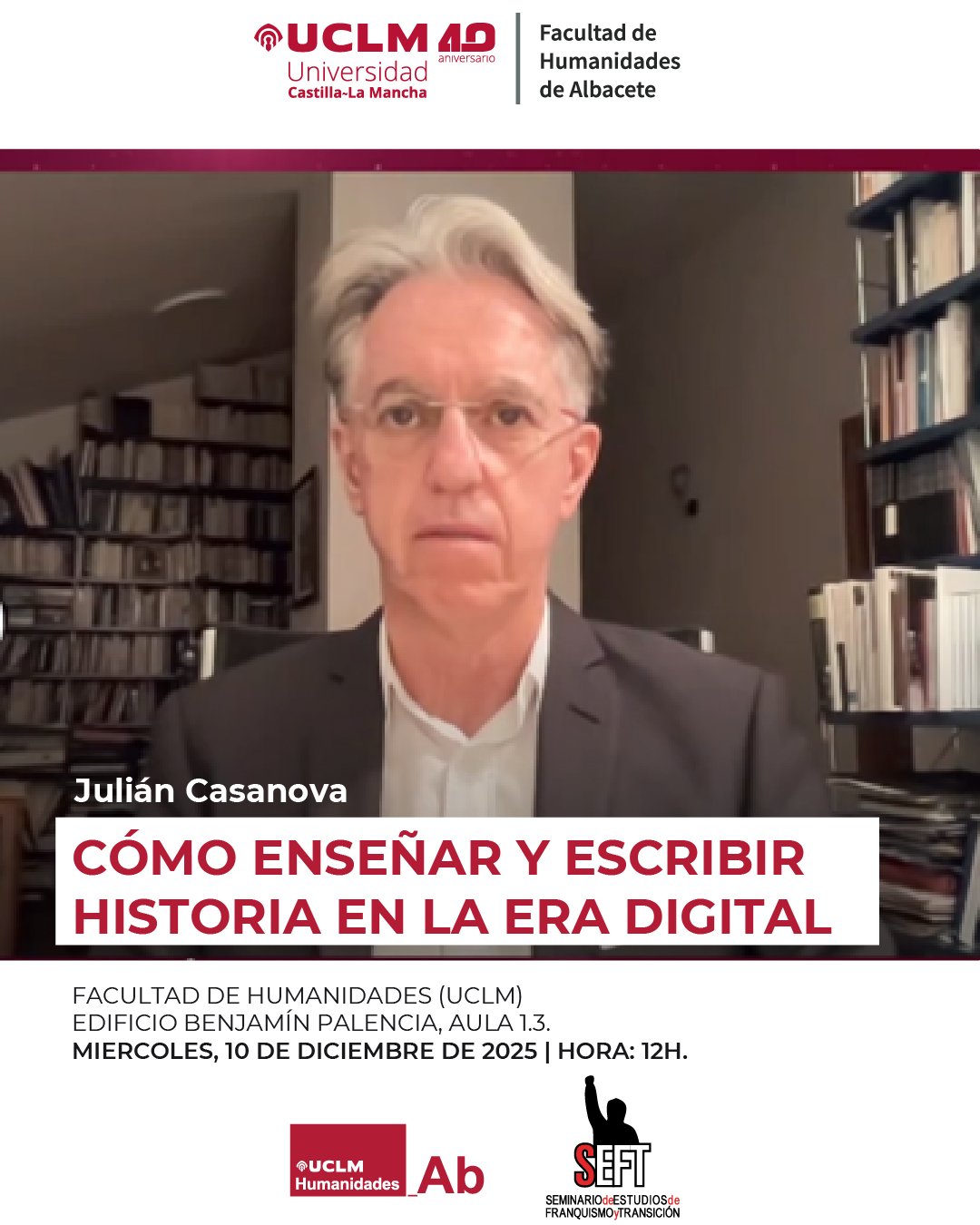El Seminario de Estudios de Franquismo y Transición (SEFT) de la Facultad de Humanidades de Albacete (UCLM) organiza el próximo miércoles 10 de diciembre de 2025 la conferencia “Cómo enseñar y escribir Historia en la era digital”, impartida por Julián Casanova, Catedrático de Historia Contemporánea en la Universidad de Zaragoza.